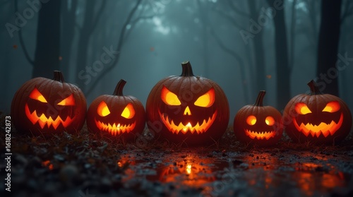 Naklejka premium Halloween illustration of five glowing jack-o'-lanterns in a foggy