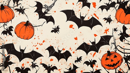 Fototapeta premium Halloween inspired design with black and orange bats pumpkins and spiders
