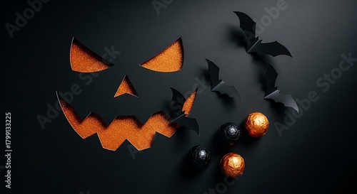 © Subrata, Fototapeta premium Halloween jack o lantern face with bats and candy on black pumpkin scary