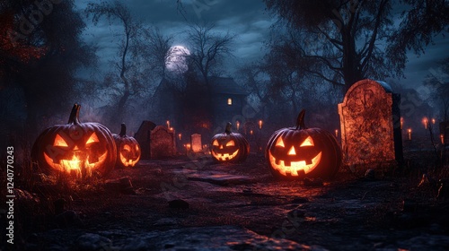 Naklejka premium Halloween jack-o'-lantern graveyard at night with moon