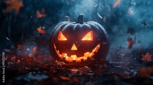 Naklejka premium Halloween Jack-O-Lantern in a Foggy Forest