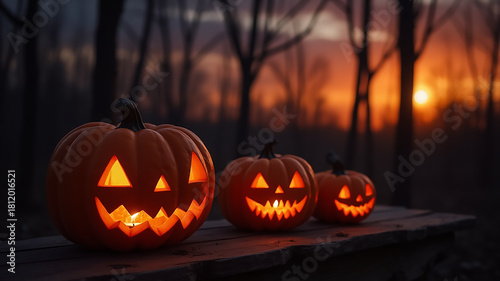 Obraz premium Halloween Jack O Lantern Pumpkins Glowing Sunset Spooky Atmosphere