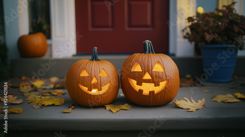 © RGolden, Obraz premium Halloween Jack-o-Lantern pumpkins in front of a house