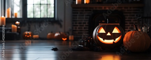 Obraz premium Halloween jack o lantern sitting on hardwood floor with fireplace