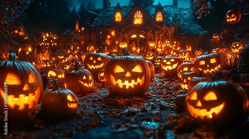 Fototapeta premium Halloween Jack O Lanterns In Front Of A Haunted House