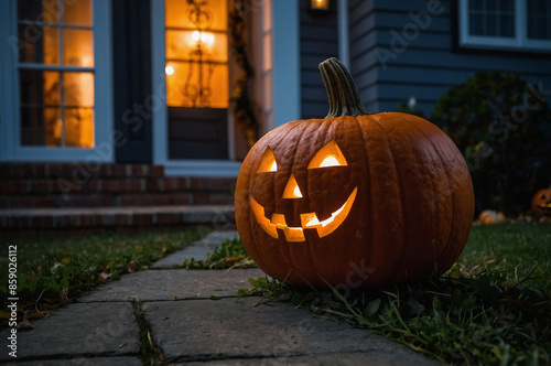 © Sebastian, Obraz premium Halloween Kürbislaterne vor einem Haus bei Nacht
