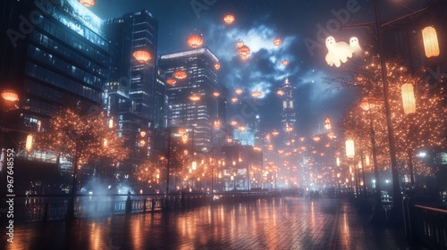 © wudu_8, Naklejka premium Halloween light festival towering buildings illuminated with ghostly figures