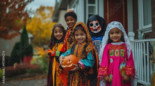 © sirisakboakaew, Fototapeta premium Halloween multicultural costumes, people dressed in traditional costumes from around the world with a Halloween twist