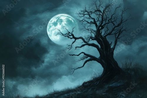 © MUdaylah, Naklejka premium Halloween night ; A dark tree against a full moon with clouds in with generative ai
