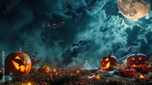 © Creations Photo , Naklejka premium Halloween Night: A spooky Halloween-themed scene with jack-o'-lanterns, bats, and cobwebs, set against a dark night sky with a full moon peeking through the clouds.