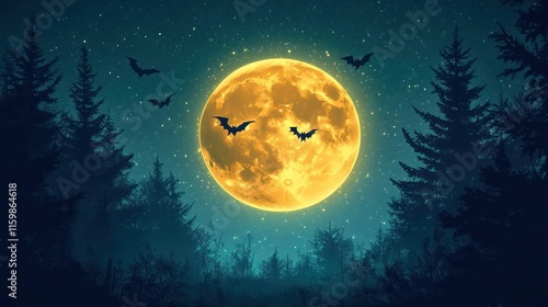 Fototapeta premium Halloween night, full yellow moon over dark forest with bats.