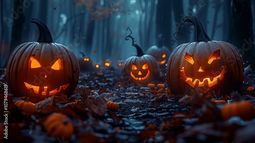 Fototapeta premium Halloween night in a dark foggy forest with spooky pumpkins and moonlight