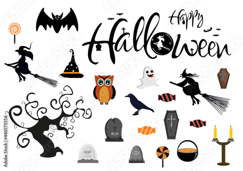 Fototapeta premium Halloween Night Party Background Silhouette Landing Page Illustration With Witch, Haunted House, Pumpkins, Bats and Other. For Add Your Design Style