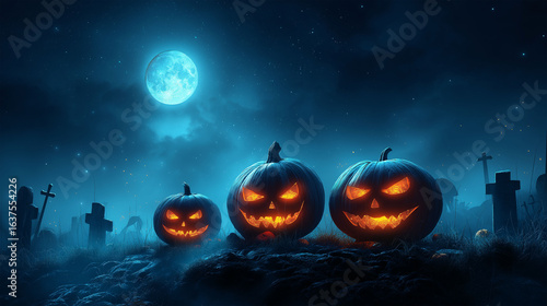 Naklejka premium Halloween Night Pumpkins: In the moonlit ambiance of Halloween night, three carved pumpkins with glowing faces illuminate a spooky cemetery scene.