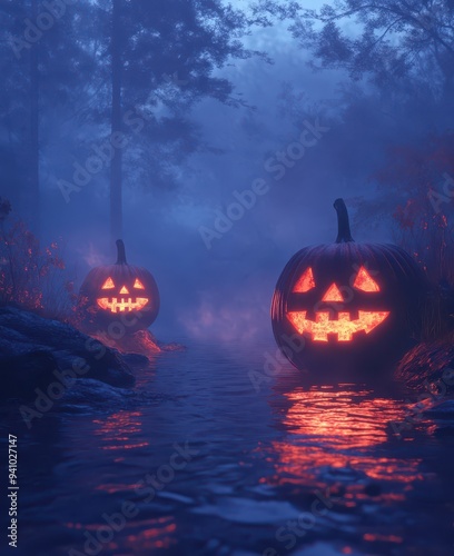 © ketsarin, Naklejka premium Halloween night safari in a misty and creepy wilderness
