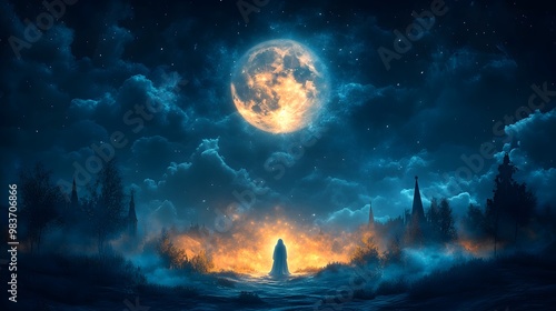 © Sarawut, Fototapeta premium Halloween night with a bright full moon and a spooky ghost, 3D vector art perfect for creating party invitations.