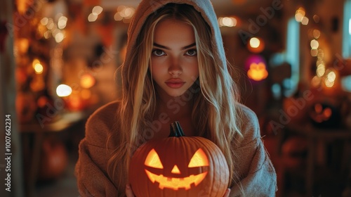 © Ельвіра Шкрабій, Obraz premium Halloween Night with Hooded Girl Holding Glowing Jack-O-Lantern