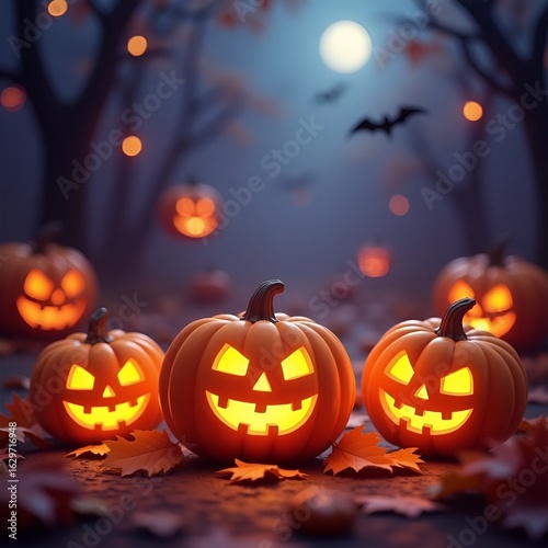 © HUSNA, Fototapeta premium Halloween Night with Many Glowing Pumpkins and Blurry Spooky Background