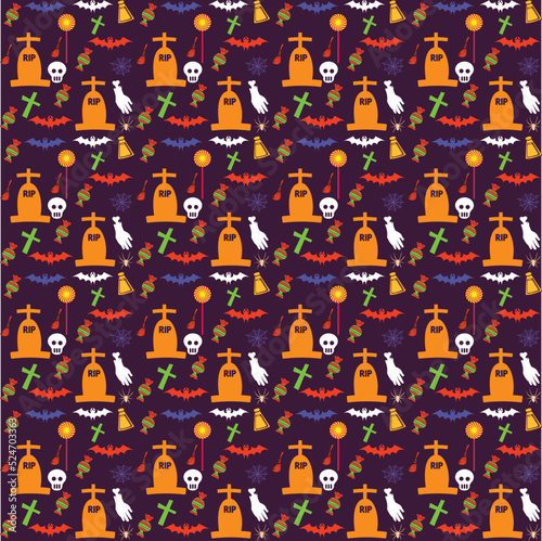 © MRK STUDIO, Obraz premium Halloween orange festive seamless pattern. Endless background with pumpkins, skulls, bats, spiders, ghosts, bones, candies, spider web and speech bubble with boo