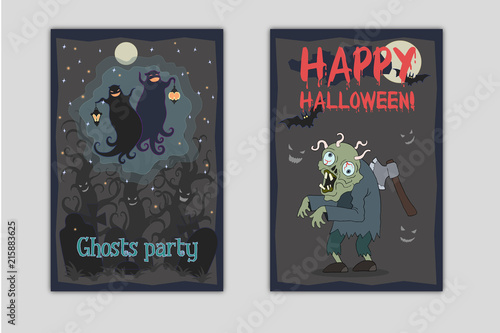 Obraz premium Halloween party flyers. Vector illustrations of two dancing funny ghosts with small lanterns in hands on a cemetery and zombie with axe in his back and worms in brain