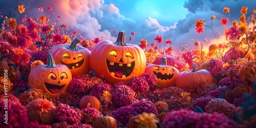 Naklejka premium Halloween party pumpkins, a whimsical, cute and glamorous life, colorful,...