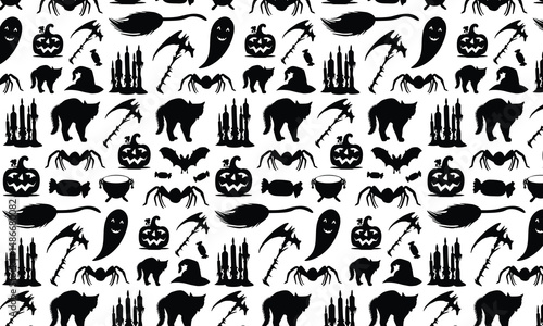 © dreamartpro, Naklejka premium Halloween Pattern Design, Vector Silhouette Pattern Design With Various Elements For Halloween Decoration, White Background Halloween Element Pattern Vector Design,