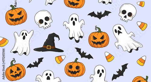 Naklejka premium Halloween Pattern with Jackolanterns Ghosts Bats Skulls Witch Hat and Candy Corn.