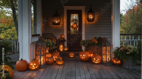 Obraz premium Halloween porch with pumpkins and lanterns at dusk .