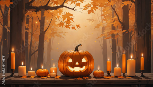 Obraz premium Halloween pumpkin and candles in autumn landscape