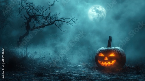 Fototapeta premium Halloween pumpkin carving celebration spooky forest digital artwork nighttime eerie atmosphere