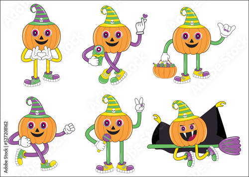 © nhjenny, Naklejka premium Halloween pumpkin character set in cartoon comic style. Happy halloween greeting with pumpkins. Halloween set of patches in cartoon comic style. Vintage Halloween pumpkin character design.