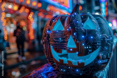 Fototapeta premium Halloween pumpkin foggy neon light background. A futuristic twist on the classic Halloween pumpkin, this cybernetic, Lantern features mechanical elements, glowing eyes, and intricate circuitry
