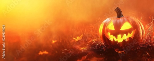Naklejka premium Halloween pumpkin glowing in a spooky forest at sunset