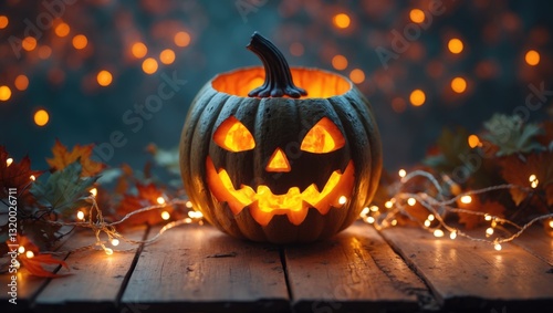 © The 2R Artificiality, Fototapeta premium Halloween pumpkin head jack o'lantern with a glowing fire in the background, wooden table adorned with light bokeh garland. Lovely Fall Arrangement.
