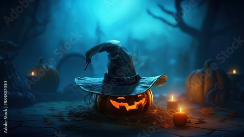 Fototapeta premium Halloween Pumpkin in a Witch Hat