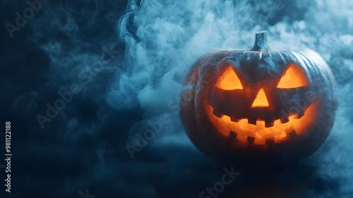 © Phichaphat, Naklejka premium Halloween Pumpkin in Blue Smoke - Spooky Night