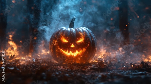 © Kamil, Fototapeta premium Halloween pumpkin in the background with a fuzzy Enchanted Forest