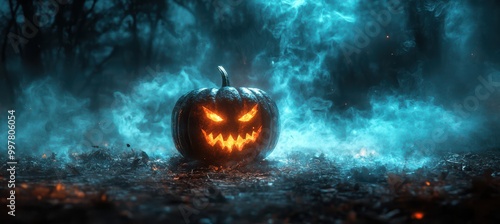 © Kamil, Fototapeta premium Halloween pumpkin in the background with a fuzzy Enchanted Forest