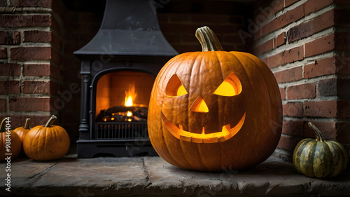 Obraz premium halloween pumpkin in the dark, jack o lantern, in a fireplace, dark, , ai generated