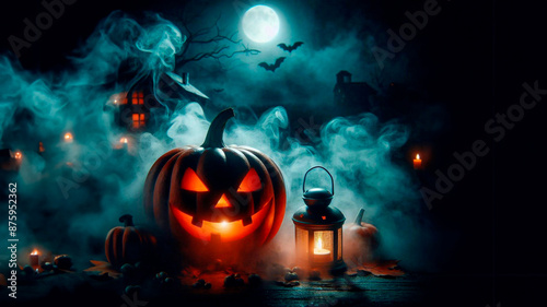 © Cliff, Fototapeta premium Halloween pumpkin in thick fog for spooky contrast and spooky atmosphere