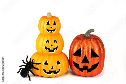 Fototapeta premium Halloween pumpkin lantern and spider isolated on white background