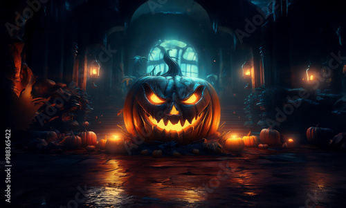 Fototapeta premium Halloween pumpkin lantern, glowing in the dark, in a scary spooky haunted house