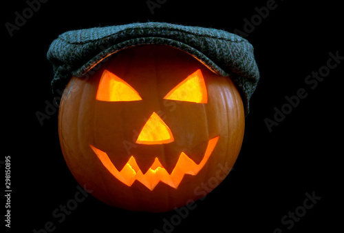 © bigal04uk, Fototapeta premium Halloween Pumpkin Lantern Wearing a Cap on a Black Background