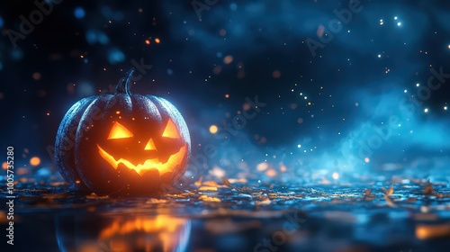 © May, Fototapeta premium Halloween pumpkin lantern with ghost in night scary autumn forest. Spooky celebration background.