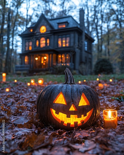 © Spyrydon, Obraz premium Halloween pumpkin near haunted house at evening