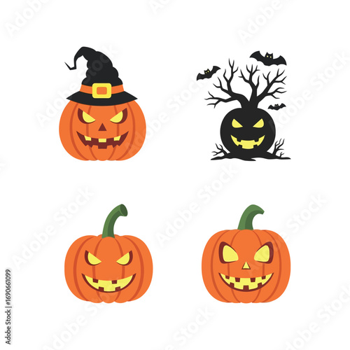 Fototapeta premium Halloween pumpkin spooky jack o lantern carved faces witch hat scary tree bats festive autumn celebration icons vector