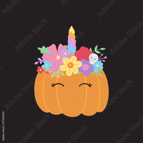 © kikivagnerova, Fototapeta premium Halloween pumpkin vector hand drawn illustration. Cute orange carved unicorn pumpkin with flowers and leaves on top, flower headband. Isolated.