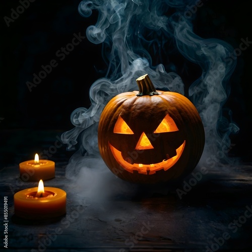 © nOegrov, Naklejka premium halloween pumpkin with candle