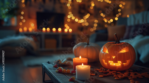 © Wasana, Obraz premium Halloween Pumpkin with Candles and Candy on a Wooden Table