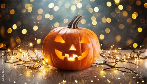 Fototapeta premium halloween pumpkin with lights and sparkle bokeh background